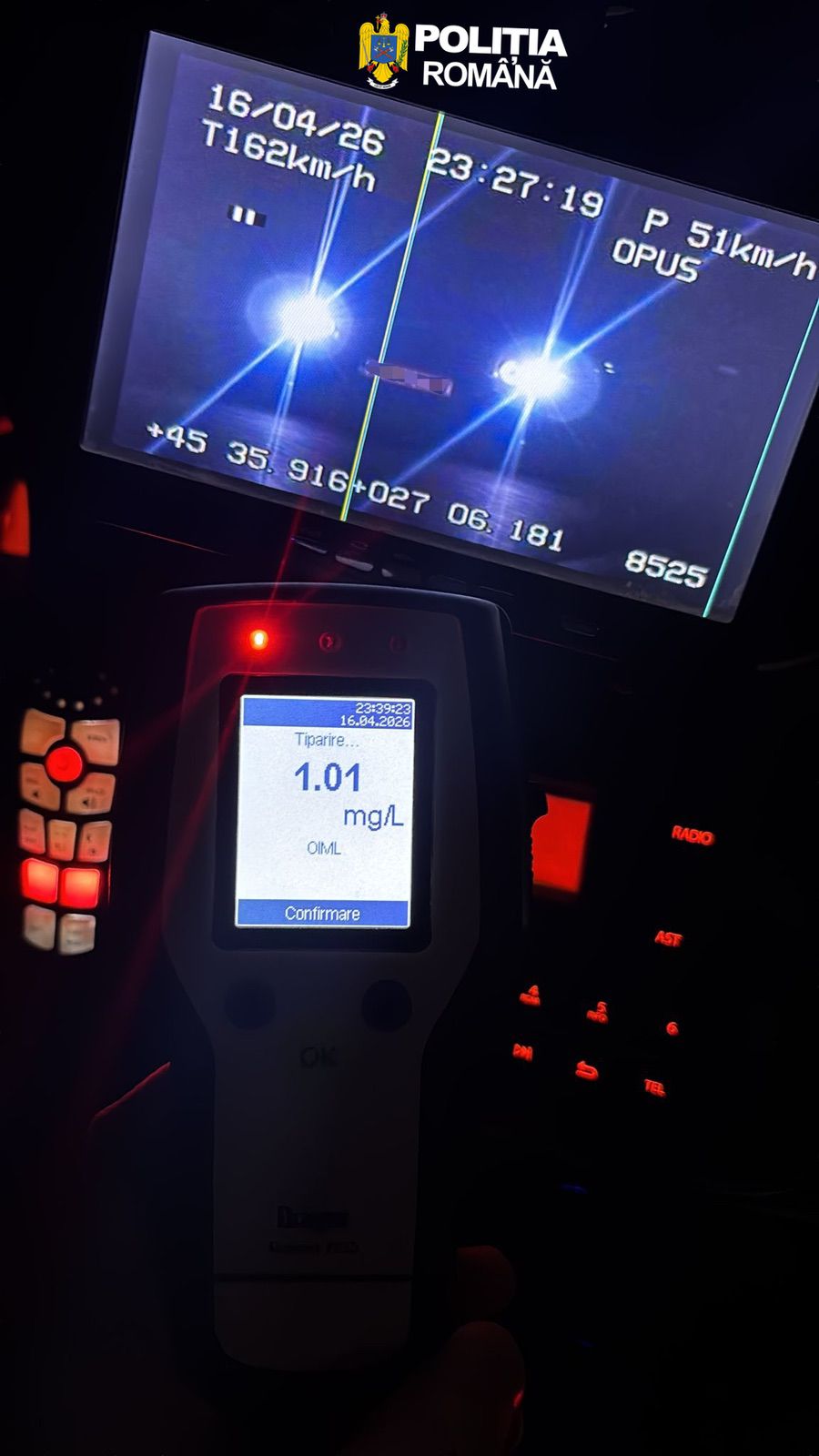 La data de 16 aprilie 2026, ora 23:27, polițiștii din cadrul Serviciului Rutier Vrancea au surprins cu aparatul radar un autoturism ce se deplasa cu viteza de 162 km/h, pe un sector de drum limitat la 50 km/h, respectiv pe DN2 E85, în localitatea Urechești. La volanul autoturismului se afla un bărbat, de 38 de ani, din comuna Negrilești. Acesta a fost testat cu aparatul alcooltest, rezultând o valoare de 1,01 mg/l alcool pur în aerul expirat. Persoana în cauză a fost condusă la o unitate medicală pentru recoltarea mostrelor biologice, în vederea stabilirii cu exactitate a alcoolemiei. În cauză a fost întocmit dosar penal sub aspectul săvârșirii infracțiunii de conducerea unui vehicul sub influența alcoolului sau a altor substanțe. (Sursa: IPJ Vrancea)