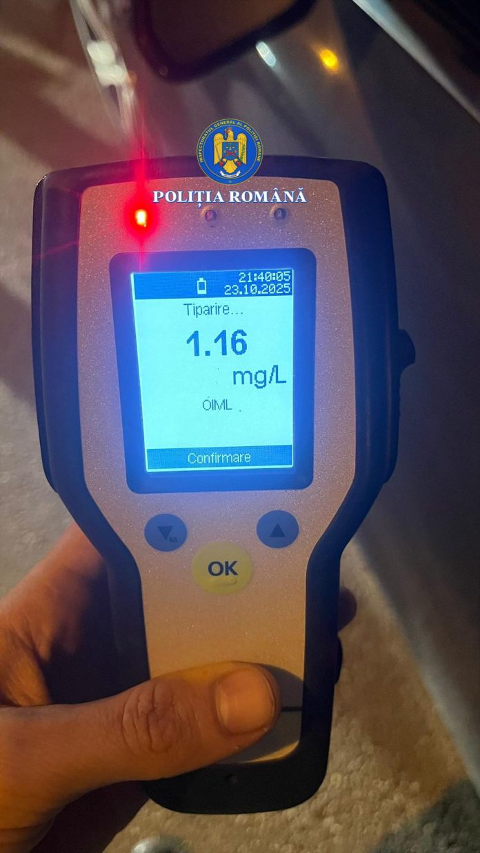 La data de 23 octombrie a.c., în jurul orei 21.30, dispeceratul Inspectoratului de Poliție Județean Vrancea a fost sesizat prin apel la SNUAU 112 cu privire la faptul că un autoturism se deplasa sinuos pe raza municipiului. În urma verificărilor efectuate, polițiștii din cadrul Biroului Rutier Focșani au depistat și oprit autoturismul pe strada Comisia Centrală, la volan fiind identificată o femeie de 38 de ani, din municipiul Focșani. Testarea acesteia cu aparatul etilometru a indicat o valoare de 1,16 mg/l alcool pur în aerul expirat.