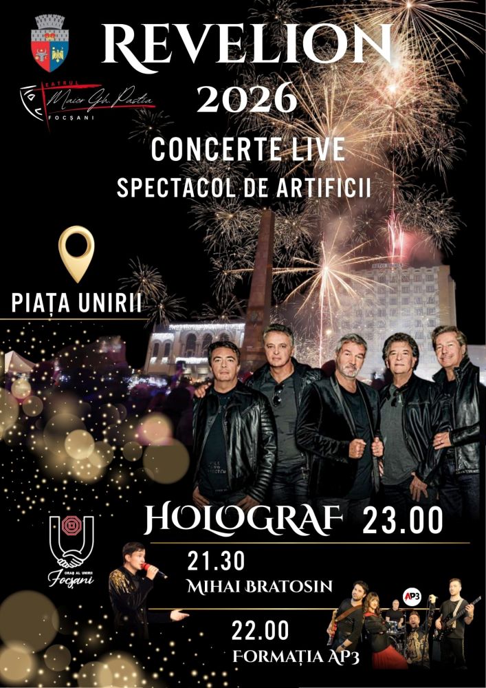 Primăria și Teatrul Municipal Focșani organizează un spectacol de Revelion în Piața Unirii. Spectacolul din noaptea dintre ani va începe la ora 21:30, cu recitalul unui tânăr vrâncean distins cu numeroase trofee și premii la festivalurile de muzică din țară și din străinătate – Mihai Bratosin. Urmează un recital al trupei rock AP3, condusă de solistul și actorul Victor Apetrei. Membrii trupei combină rock-ul cu mai multe genuri muzicale. Capul de afiș al spectacolului de Revelion din Focșani este formația Holograf. Recitalul lui Bittman&comp se va încheia la miezul nopții, atunci când va începe tradiționalul foc de artificii.