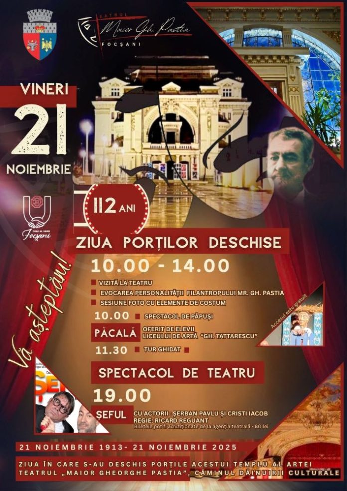 Ziua de sărbătoare – vineri, 21 noiembrie – va începe la ora 10:00, cu o piesă de teatru de păpuși pentru copii – Păcală. Piesa va fi jucată de elevii Liceului de Artă „Gh. Tattarescu” și regizată de prof. Radu Pocovnicu. Apoi, începând cu ora 11:30, se va organiza un tur ghidat, în care va fi prezentată povestea acestui lăcaș de cultură lăsat moștenire focșănenilor de maiorul Gheorghe Pastia. Vizitatorii vor putea admira și o expoziție fotografică impresionantă prin care sunt ilustrate etapele transformării Teatrului ”Maior Gh. Pastia”. Totodată, vizitatorii vor avea ocazia să își facă fotografii cu costumele folosite de actorii teatrului pentru piesele puse în scenă de-a lungul anilor. Ziua de sărbătoare se va încheia cu o piesă de teatru – comedia de mare succes „Șeful”, de Eduardo Aldán, în regia lui Ricard Reguant, cu celebrii actori Șerban Pavlu și Cristi Iacob. Spectacolul va începe la ora 19:00. Prețului unui bilet este 80 de lei. (sursa: Teatrul Municipal Focșani)