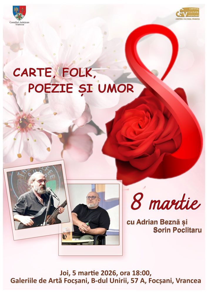 Povestea noastră merge mai departe pe 5 martie 2026, la ora 18:00. Într-o zi de joi, ne pregătim să sărbătorim femeia prin evenimentul „𝘊𝘢𝘳𝘵𝘦, 𝘍𝘰𝘭𝘬, 𝘗𝘰𝘦𝘻𝘪𝘦 𝘴̗𝘪 𝘜𝘮𝘰𝘳”. Va fi o seară de neuitat alături de Adrian Beznă și Sorin Poclitaru. Așteaptă-te la versuri care ating sufletul, acorduri de chitară care îndeamnă la visare și, bineînțeles, acea doză de umor care face viața mai frumoasă. Este cadoul perfect înainte de weekend-ul de 8 Martie. (sursa: Centrul Cultural Vrancea)