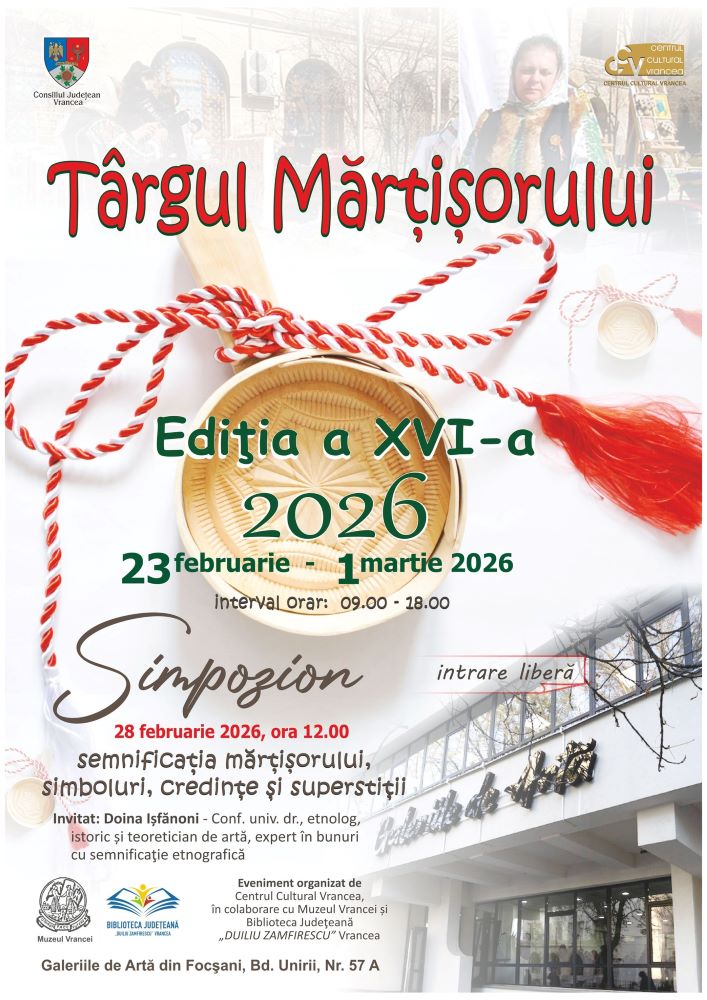 Abia se sting ecourile fluierelor, că pe 23 februarie Galeriile se transformă. Începe 𝘛â𝘳𝘨𝘶𝘭 𝘔ă𝘳𝘵̗𝘪𝘴̗𝘰𝘳𝘶𝘭𝘶𝘪, ajuns la ediția a XVI-a. Timp de o săptămână, până pe 1 martie, în intervalul orar 09:00 și 18:00, poți găsi acel simbol mic și prețios care vestește primăvara. Dar mărțișorul nu e doar un obiect, e o întreagă filozofie. De aceea, pe 28 februarie, la ora 12:00, te invităm la un simpozion despre „Semnificația mărțișorului, simboluri, credințe și superstiții”. O vom avea invitată pe doamna Doina Ișfănoni, etnolog și istoric de artă, care ne va ajuta să descifrăm tainele acestui obiect de patrimoniu. Evenimentul este rezultatul colaborării dintre Centrul Cultural Vrancea, Muzeul Vrancei și Biblioteca Județeană „Duiliu Zamfirescu”.