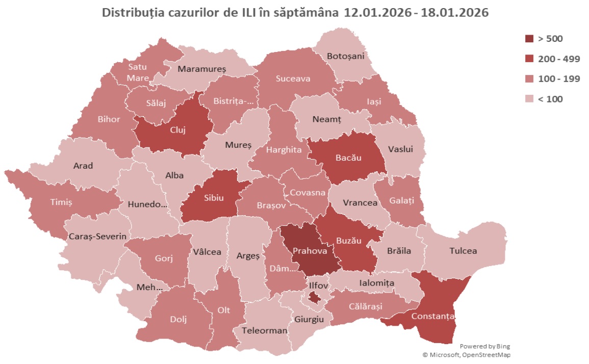 – 6.287 cazuri de gripă clinică la nivel național, comparativ cu 8.585 înregistrate în săptămâna precedentă și cu 6.994 în aceeași săptămână a sezonului precedent și de 1.5 ori mai multe față de media ultimelor 5 sezoane (4.194). Cazurile de gripă clinică au fost raportate de toate județe, cele mai multe fiind în municipiul București (760) și în județele Prahova (541), Cluj (472) și Constanța (464).