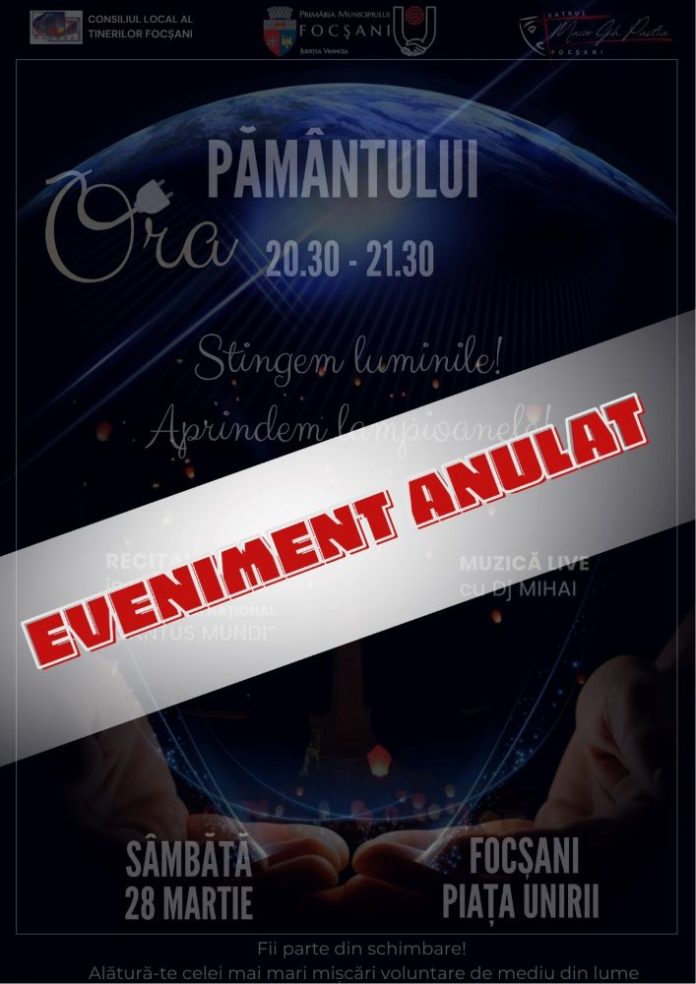 Astăzi, pe tot globul se marchează Ora Pământului. Cu această ocazie, în multe orașe din lume se închide iluminatul public sau în instituțiile publice (dar nu numai), timp de cel puțin o oră. Și în Focșani se marchează Ora Pământului, atât prin închiderea iluminatului public cât și prin alte evenimente. Însă, în acest an, starea vremii a dat peste cap planul inițial: nu vor mai avea loc două acțiuni populare în rândul tinerilor. ”Împreună cu Consiliul Local al Tinerilor am decis reprogramarea pentru 1 iunie a lansării de lampioane și a recitalului coral programate pentru sâmbătă seară, 28 martie, din cauza vremii nefavorabile. Totuși, vom marca evenimentul „Ora Pământului“ prin închiderea iluminatului public, timp de o oră, sâmbătă seară, 28 martie, între orele 20.30 – 21.30. „Ora Pământului“ este cea mai mare mișcare voluntară de mediu din lume iar anul acesta se împlinesc 20 de ani de la prima ediție organizată în Sydney, Australia. Cele 1.500 de lampioane biodegradabile le vom păstra pentru a da culoare zilei de 1 Iunie, și vor fi utilizate în cadrul activităților dedicate Zilei Internaționale a Copilului.”, au precizat reprezentanții Primăriei Focșani. Reamintim că județul Vrancea se află sub atenționare cod galben de vânt și precipitații până luni dimineață.