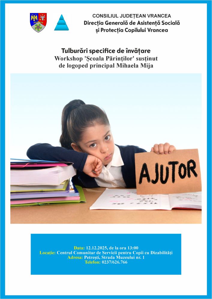Direcția Generală de Asistență Socială și Protecția Copilului Vrancea organizează un nou workshop în cadrul programului educațional ’Școala părinților’, cu tema ‘Tulburări specifice de învățare’. Evenimentul va avea loc vineri, 12 decembrie 2025, începând cu ora 13:00, la Centrul Comunitar de Servicii pentru Copii cu Dizabilități Petrești. Workshopul va fi susținut de Mihaela Mija, logoped principal în cadrul centrului, care va oferi părinților și specialiștilor informații esențiale despre identificarea, înțelegerea și abordarea corectă a tulburărilor specifice de învățare (TSI) la copii.